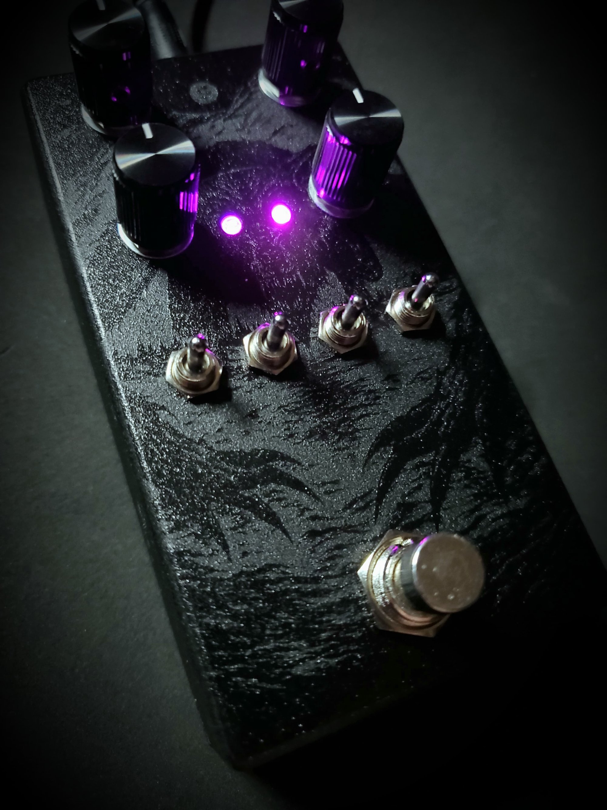 This pedal features a matte black finish with black screen-printed artwork, black aluminum knobs, and pink LEDs. In the interest of keeping things clean and minimal, control labels in the artwork have been omitted.